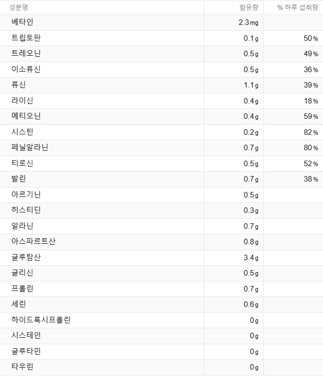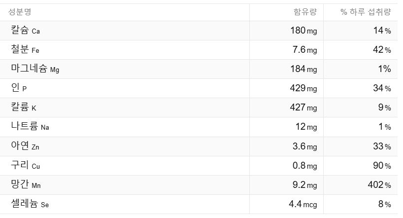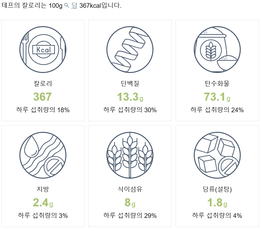 분들에게도 아주 좋은 식품입니다. 영양학적으로 우수한 곡물인 테프의 100g 당 영양성분은 아래와 같습니다.