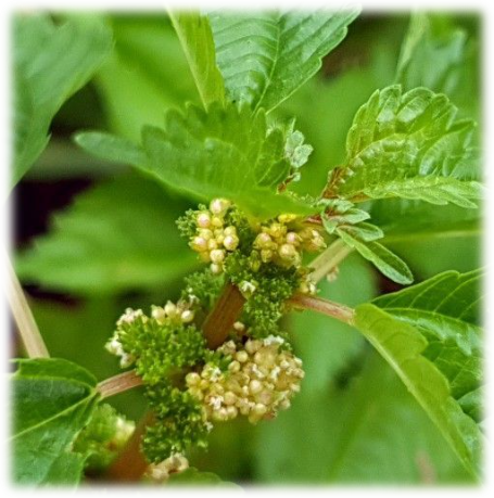 꽃은 암수한그루로 취산꽃차례이며 녹색이고 잎겨드랑이에 달립니다. 수꽃은 꽃덮이 2장, 수술 2개이며, 암꽃은 꽃덮이 3장,